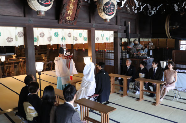 お二人もまた、お宮参りや七五三、お正月には初詣、受験があれば合格祈願など人生の節目には必ず神社へ参拝し、神様の存在が身近であることを改めて実感していらっしゃいました。挙式当日はご家族やご親族も集い、厳かに式を執り行いました。挙式後も新しい命が無事誕生したことや、再び神社へ足を運んでおられること、日々のお子様のことなど、プランナーであるわたしに今でも報告しにきてくださいます。みなさまとのご縁に感謝し、幸福への祈り、慶の宴をこれからもずっと大切にされていくことでしょう。
